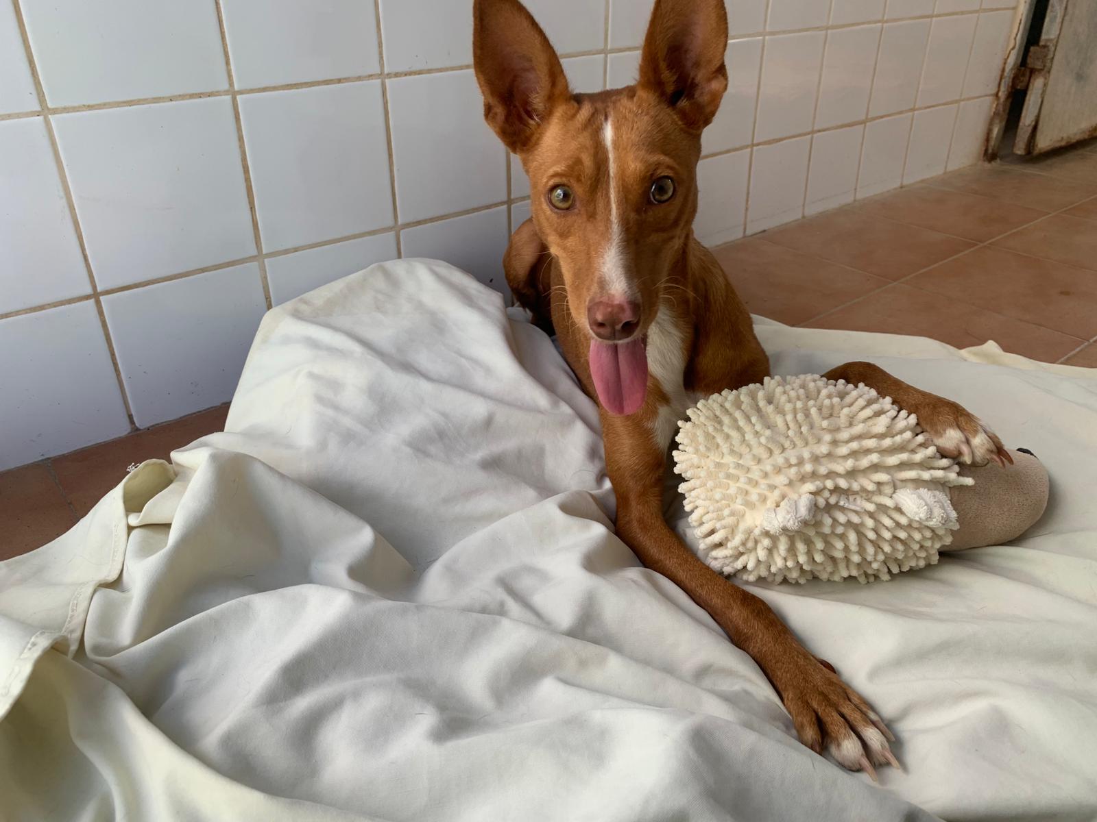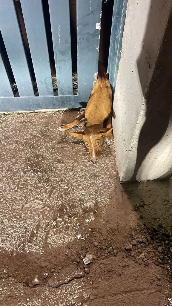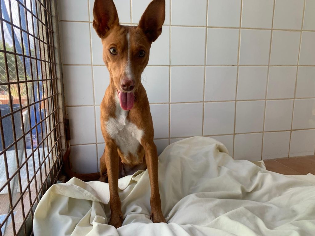 Dit kleine Podenco teefje heet Olive. Ze werd gevonden toen ze klem zat tussen een automatische poort. Gelukkig werd ze bevrijd omdat de buren een gekrijs hoorden. Olive was gelukkig niet gewond. Zij is super lief, aanhankelijk en een blijde hond. Ondanks wat gebeurd is, is ze een vrolijk hondje dat heel graag bij je wil zijn. Ze is gesteriliseerd. Olive loopt al netjes mee aan de riem en andere honden vindt ze ook leuk. Haar gewicht is ongeveer 8 kg, schofthoogte ca. 40 cm.