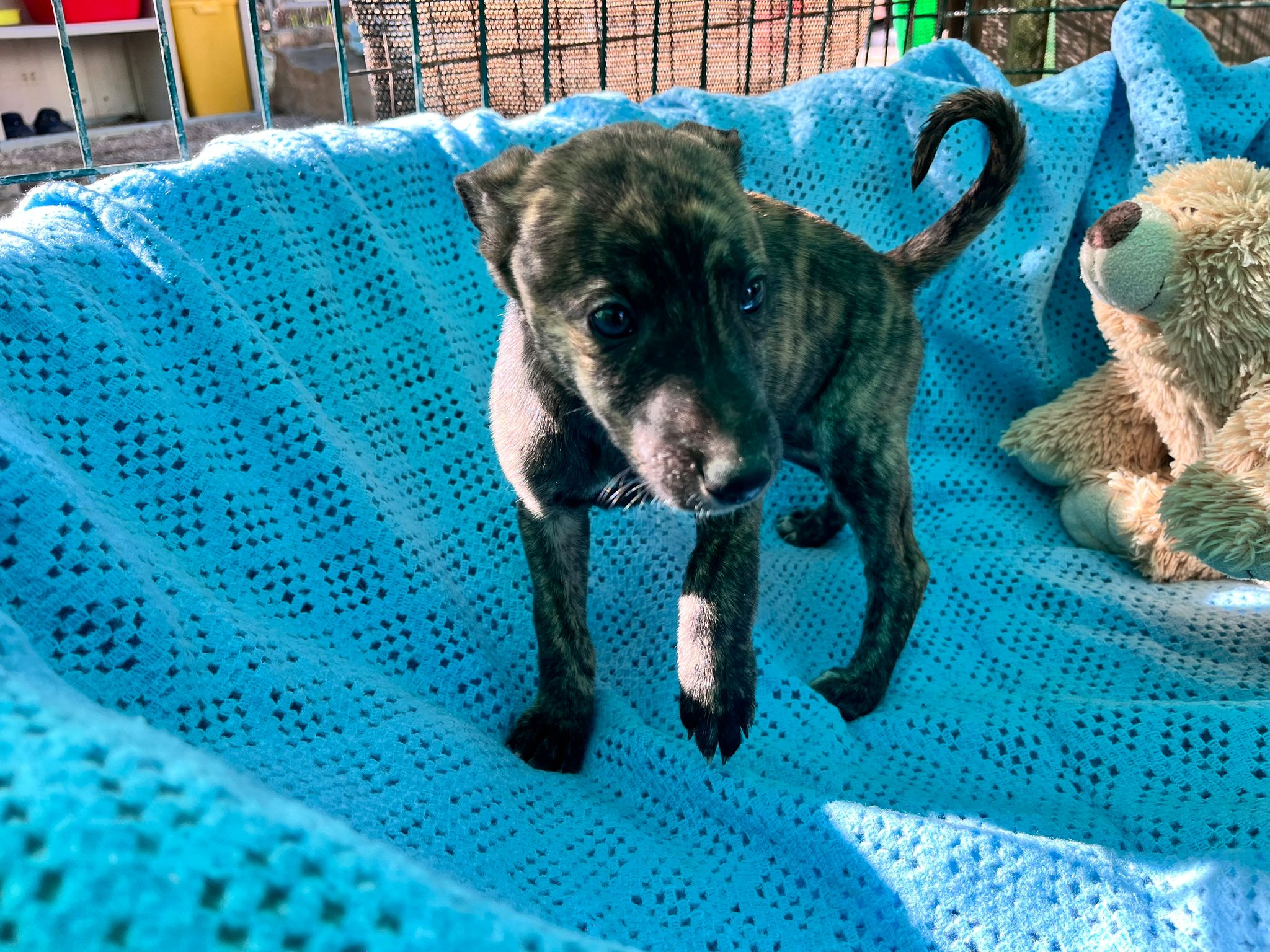 Tien puppy’s werden samen met hun moeder gevonden in de campo in San Isidro, waar ze in een vossenhol leefden. Met geduld en zorg konden onze collega’s ze allemaal veilig vangen, inclusief hun moeder, Romy.