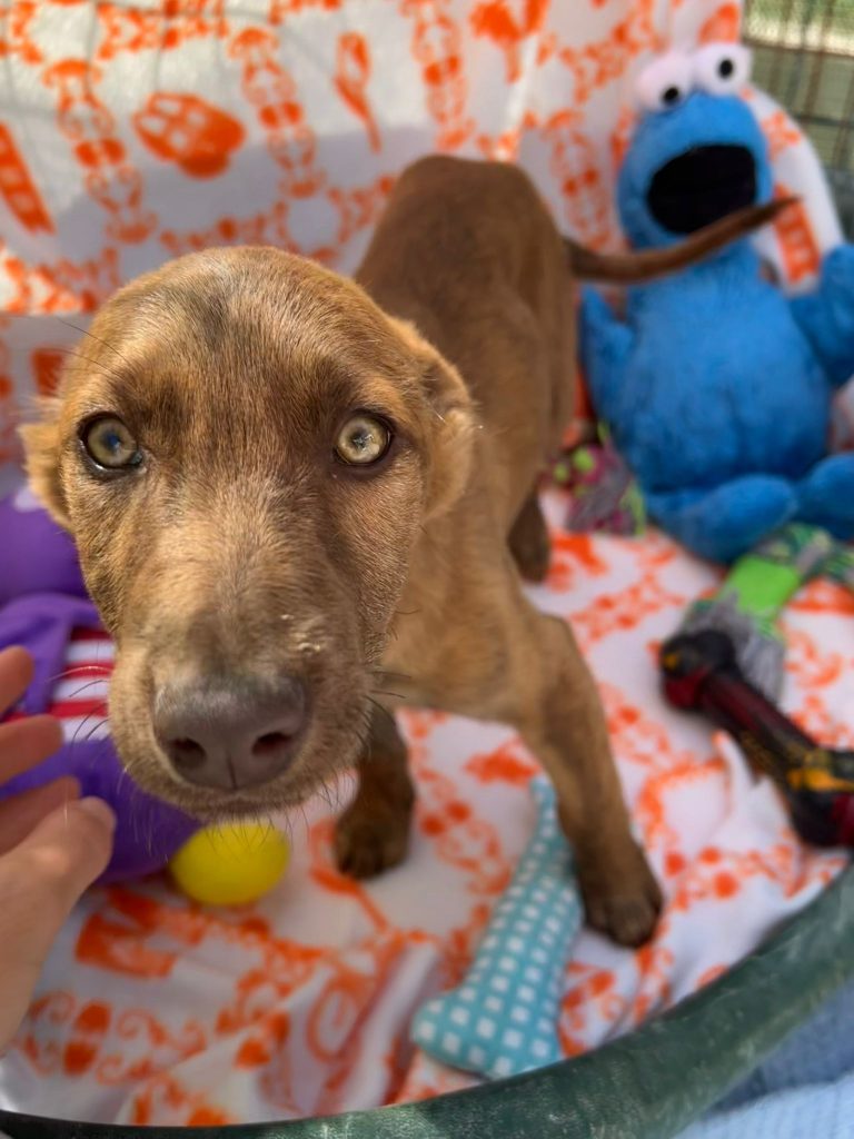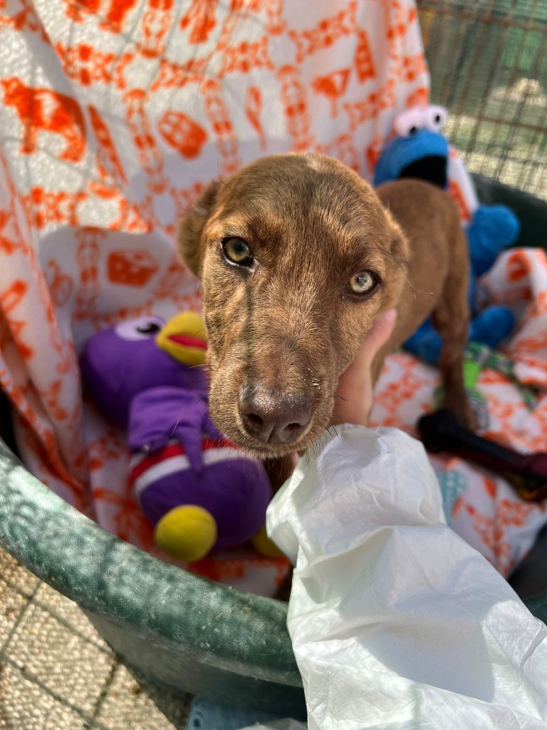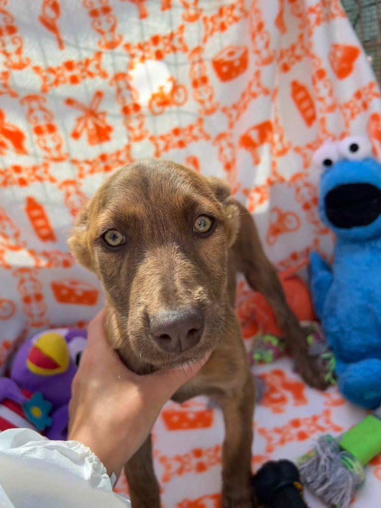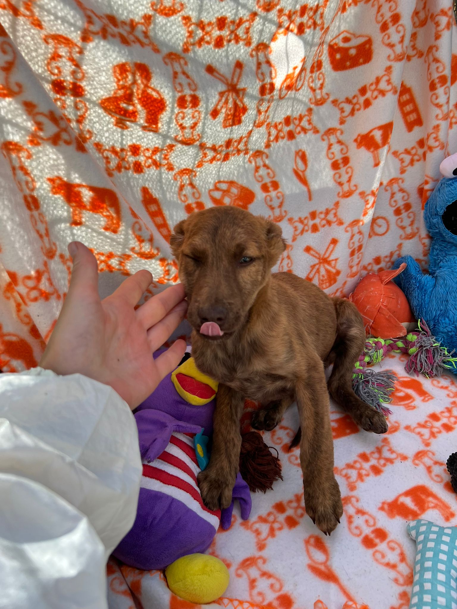 Onze collega’s kregen een paar telefoontjes dat een moederhond met zes puppy’s op een weg liep. Het was duidelijk dat er iets aan de hand was met haar rechter achterpootje. Ze was heel lief en vriendelijk. De moeder werd Senna genoemd en is hoogstens 1 jaar jong.